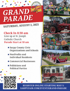 The Grand Parade is held on Saturday of the Fair at 10:00 AM. Check-in begins at 8:30 AM at St. Joseph’s Catholic Church, 100 9th St, Springfield, NE 68059.